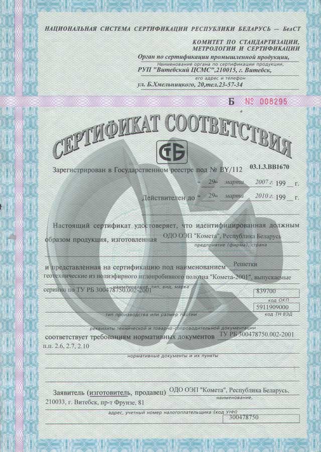 Предприятие «Комета» приступило к разработке технологии производства георешеток из полиэфирного нетканого полотна по инициативе могилевских строителей-дорожников. Высоко оценивая эффективность применения пластиковых георешеток для укрепления дорожных покрытий и откосов, они не могли не заметить ряд недостатков таких решеток в некоторых областях применения. Например, при использовании георешеток для укрепления откосов дорог со временем наблюдается отторжение пластика растительным грунтом, с выдавливанием его на поверхность, а также нарушение дренажа грунтовых вод в верхних слоях. Поэтому было предложено для укрепления откосов использовать более приемлемый с экологической точки зрения материал георешеток – полиэфирное иглопробивное полотно. Нетканое полотно хорошо пропускает грунтовые воды, прорастает корнями растений и со временем становится неотъемлемой составляющей армированного растительного грунта.