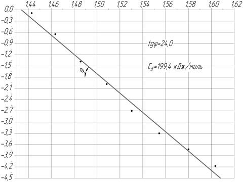 Вычисляют с точностью до 0,1 тангенс угла наклона φ построенной прямой линии к оси ординат. Определяют значение энергии активации Ед, кДж/моль, по формуле: