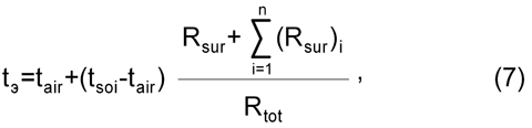 где tair – температура воздуха, °С; tsoi – температура грунта на нижней границе системы «одежда – полотно», °С. Принимаем значения tsoi на глубине 0,8 м (поскольку общая высота дорожной конструкции составляет 0,7 м) и tair по каждому месяцу; Rsur – сопротивление теплопереходу покрытия, м2 · °С/Вт, принимаемое в расчетах в зависимости от скорости ветра, м/с. Значения скорости ветра по месяцам колеблются в пределах 2,6 – 3,7 м/с, а значения Rsur соответственно от 0,0765 до 0,084 м2 · °С/Вт; Rtot – общее тепловое сопротивление дорожной конструкции, м2 · °С/Вт.